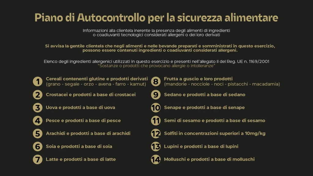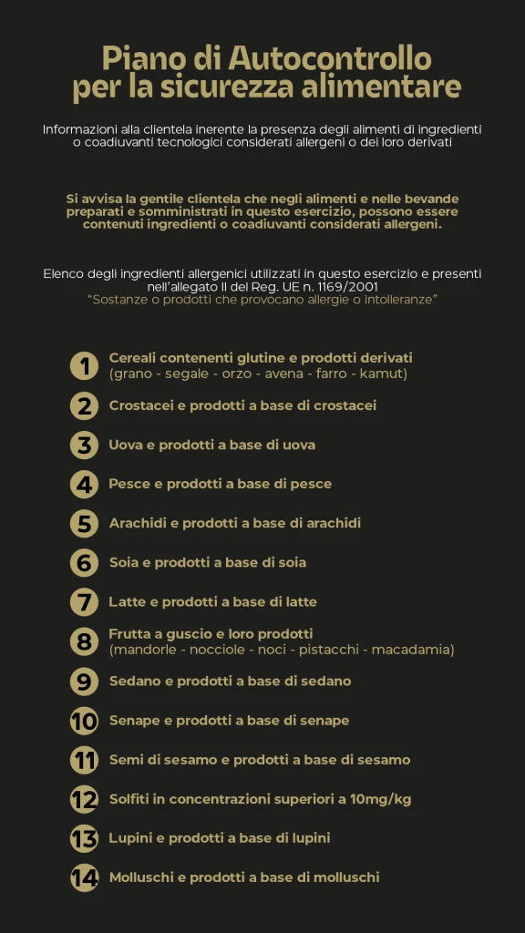 Il cliente è tenuto a comunicare eventuali allergie o intolleranze alimentari al personale di sala al momento dell’ordinazione.